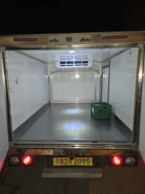 전체적으로 깔끔한 외관을 유지하고 있으며, 냉동기 내부 역시 오염 없이 청결한 상태를 자랑합니다. 저상 탑차 형태로 설계되어 지하 주차장 진입이 용이하다는 점도 큰 매력 포인트입니다.