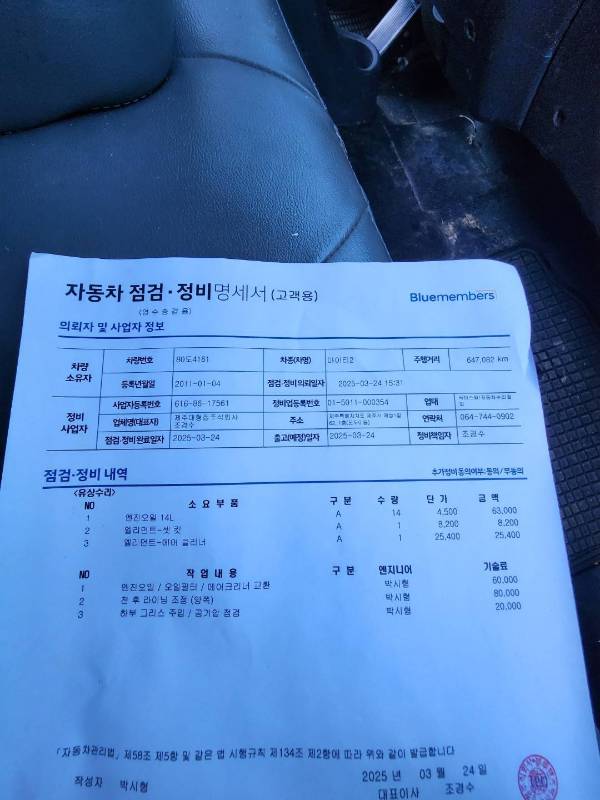* **최근 정비**: **작년 자동차 검사를 무사히 통과**하였으며, 오일류 일체를 교환 완료했습니다.