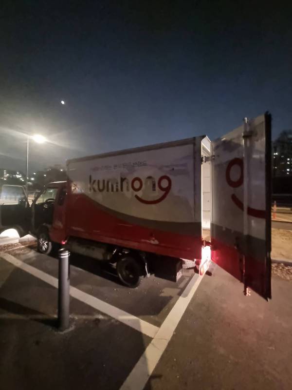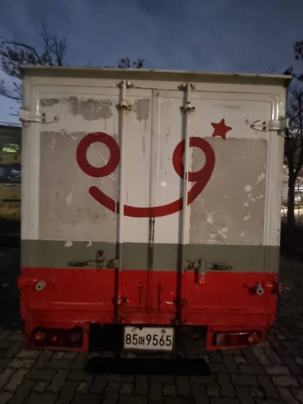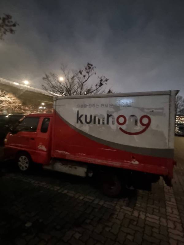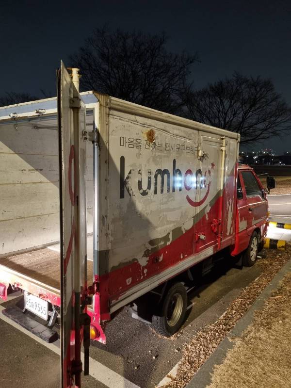 차량의 전반적인 상태를 사진으로 확인해 보세요. 외부에는 Kumhong 로고와 친근한 스마일 캐릭터가 부착되어 있으며, 내부 적재함 또한 효율적인 수납 공간을 제공합니다.