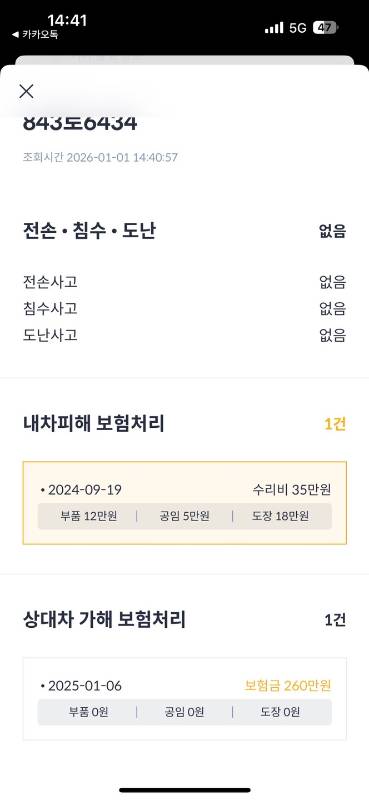 3. **보험 이력:** 내 차 피해 1건(수리비 약 35만원 수준의 단순 수리)과 상대차 가해 1건이 존재합니다.
