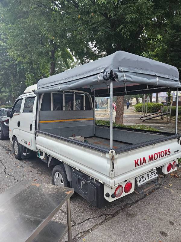 적재함 부분에는 호로(덮개)가 설치되어 있어 화물을 눈이나 비로부터 안전하게 보호할 수 있는 실용성까지 더했습니다. 5인승 더블캡 모델이라 인원 수송과 화물 운반을 동시에 해결해야 하는 사업자분들께 최적의 선택이 될 것입니다.