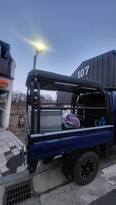 적재함 상단에는 추가적인 랙과 수납함이 설치되어 있어, 장비 보관이나 루프탑 텐트 설치 등 확장이 용이합니다. 또한, 야간 작업 시 유용한 조명 시스템까지 완비되어 있습니다.