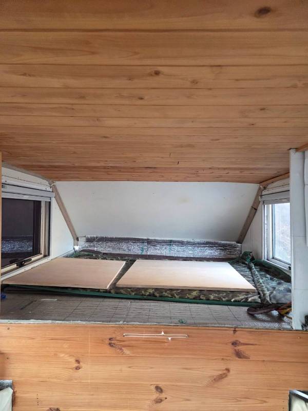 내부에는 간단한 조리가 가능한 **싱크대와 가스레인지 공간**이 마련되어 있으며, 아늑하게 쉴 수 있는 **생활 및 취침 공간**이 확보되어 있습니다. 천장은 깔끔한 우드 톤으로 마감되어 있어 캠핑의 감성을 더해줍니다.